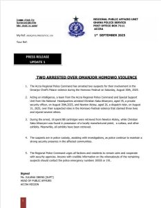 The Accra Regional Police Command has arrested two suspects in connection with the violent clashes at the Omanjor Chief’s Palace during the Homowo Festival on August 30, 2025.